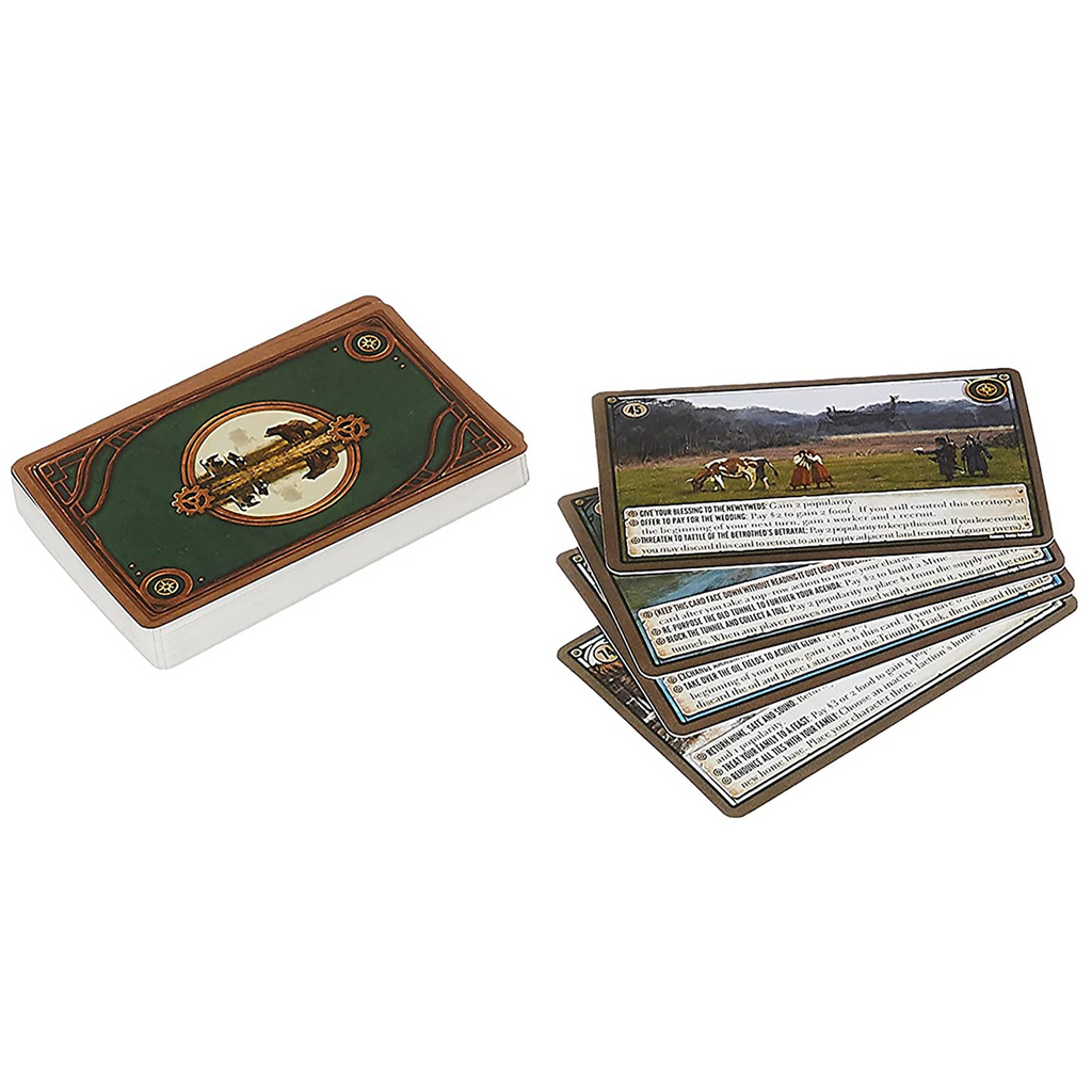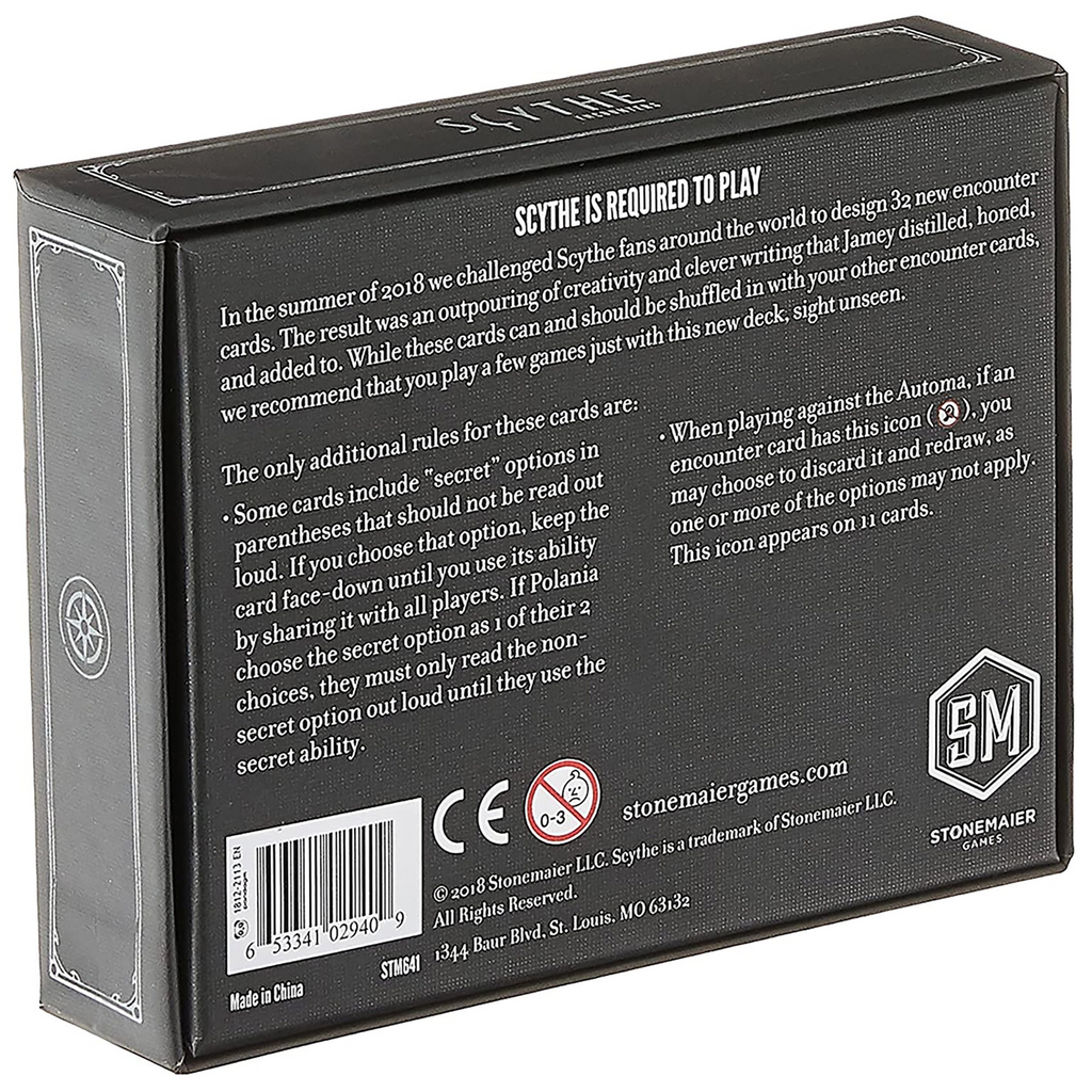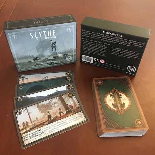 Scythe Encounters is a boxed set of 32 brand-new promo encounter cards. These cards feature a number of innovations in the encounter system. We recommend that you play with them on their own for a few games; after that you can shuffle them into the regular encounter deck.
