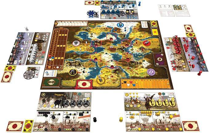 Each player begins the game with different resources (power, coins, combat acumen, and popularity), a different starting location, and a hidden goal. Starting positions are specially calibrated to contribute to each faction’s uniqueness and the asymmetrical nature of the game (each faction always starts in the same place).