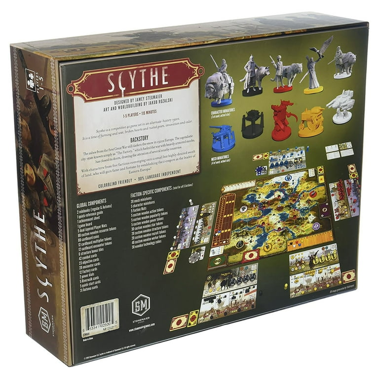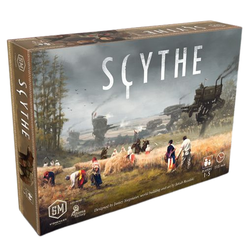 Scythe is an engine-building game set in an alternate-history 1920s period. It is a time of farming and war, broken hearts and rusted gears, innovation and valor. In Scythe, each player represents a character from one of five factions of Eastern Europe who are attempting to earn their fortune and claim their faction's stake in the land around the mysterious Factory. Players conquer territory, enlist new recruits, reap resources, gain villagers, build structures, and activate monstrous mechs.