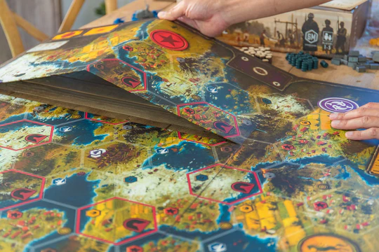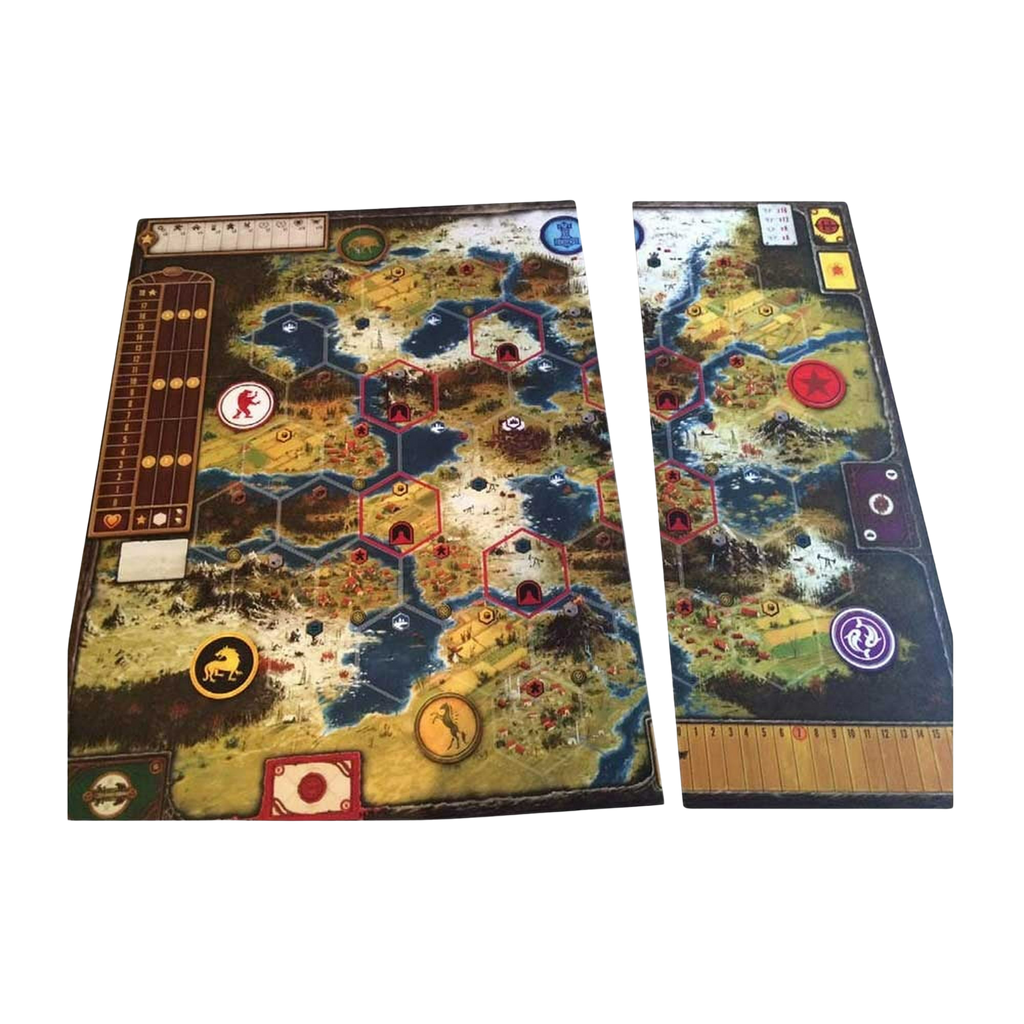 The board extension slides next to the back side of the standard game board, creating a complete board with 70% bigger hexes (the content is the same). All units and resources in Scythe are kept on the board, so the larger hexes provide more space. The standard game board is 624x818mm, and it grows to 818x939mm with this extension.